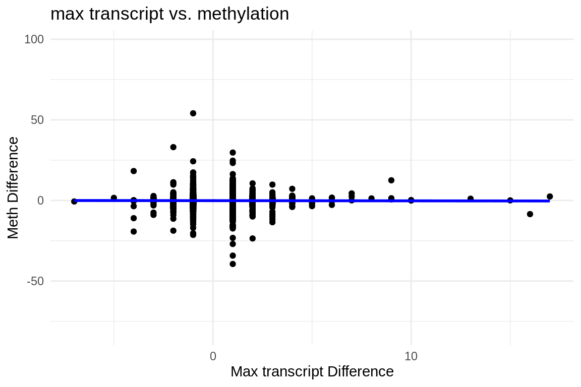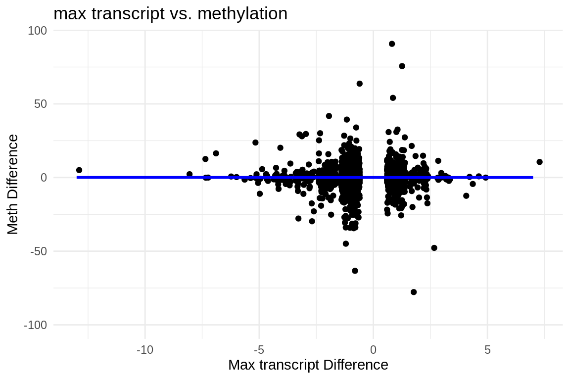 labs(x = "Max transcript Difference", y = "Meth Difference", title = "max transcript vs. methylation") +