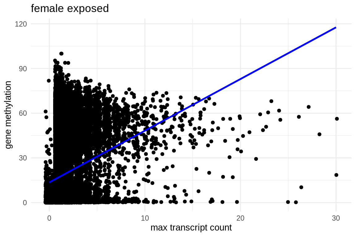 labs(x = "max transcript count", y = "gene methylation", title = "female exposed") +