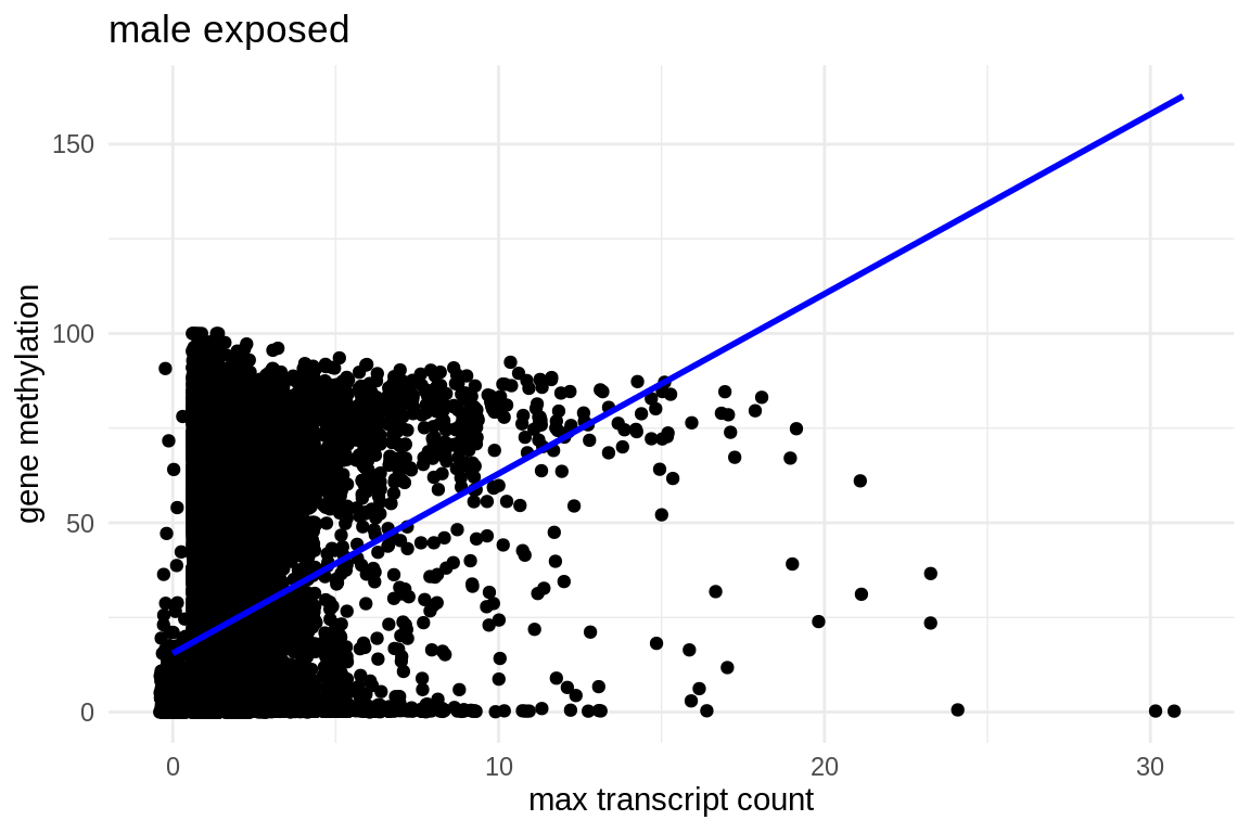 labs(x = "max transcript count", y = "gene methylation", title = "male exposed") +