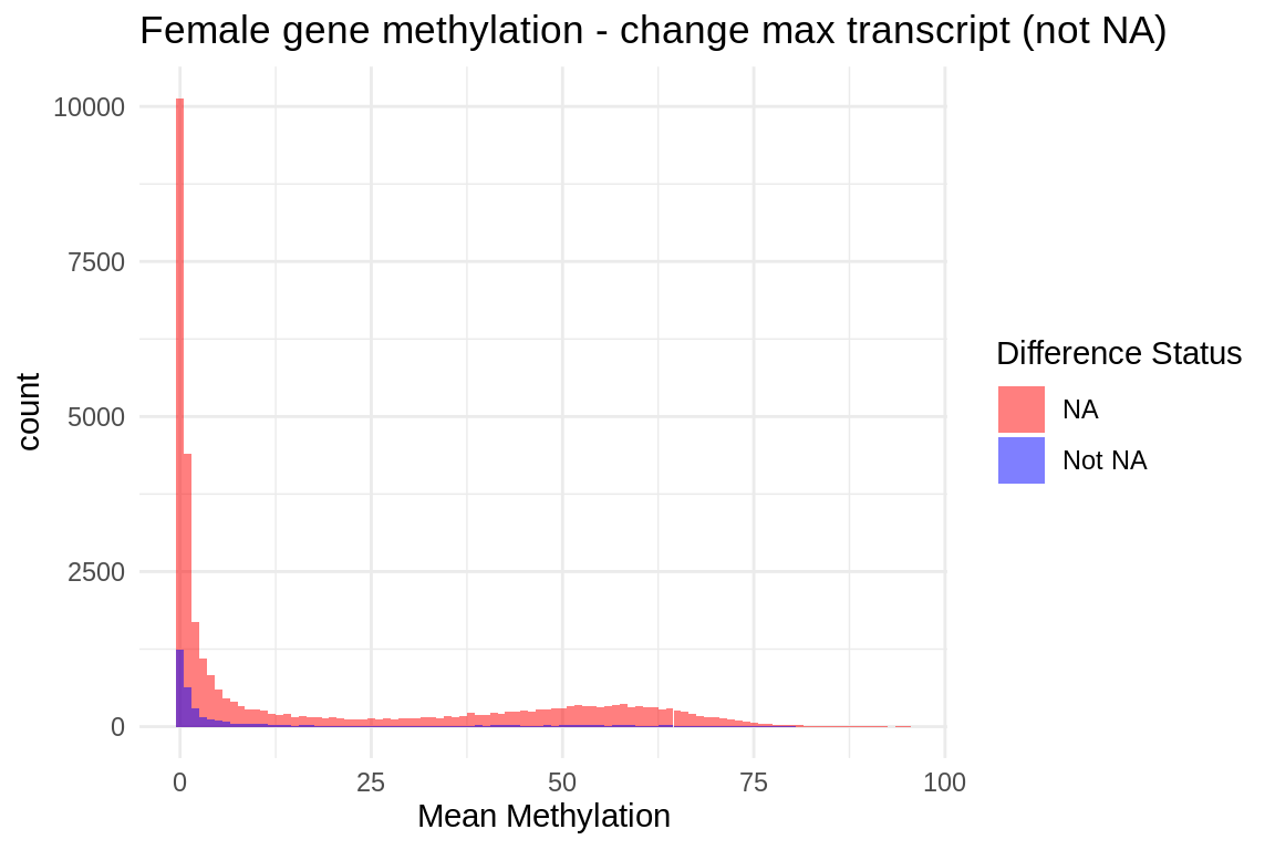 ggtitle("Female gene methylation - change max transcript (not NA)")