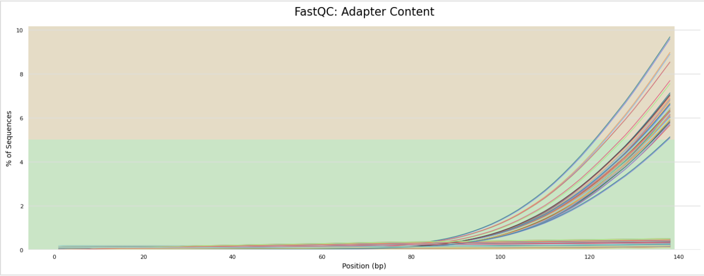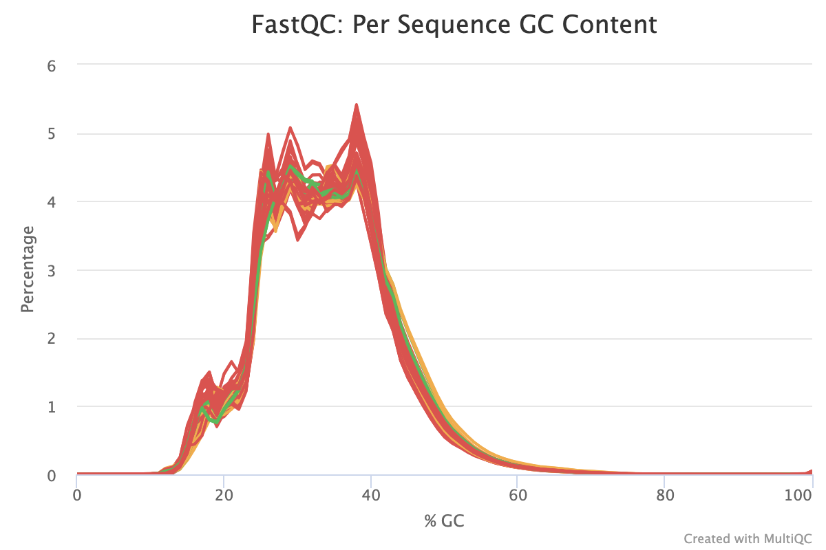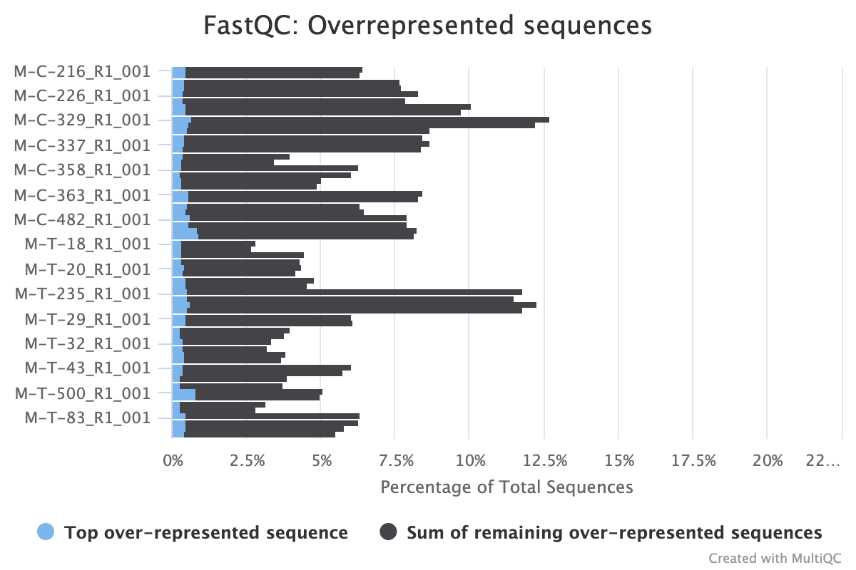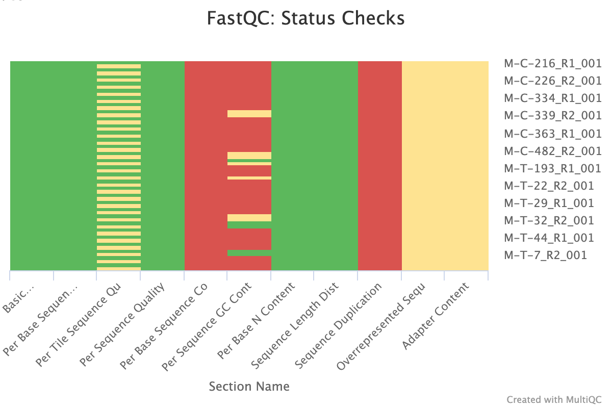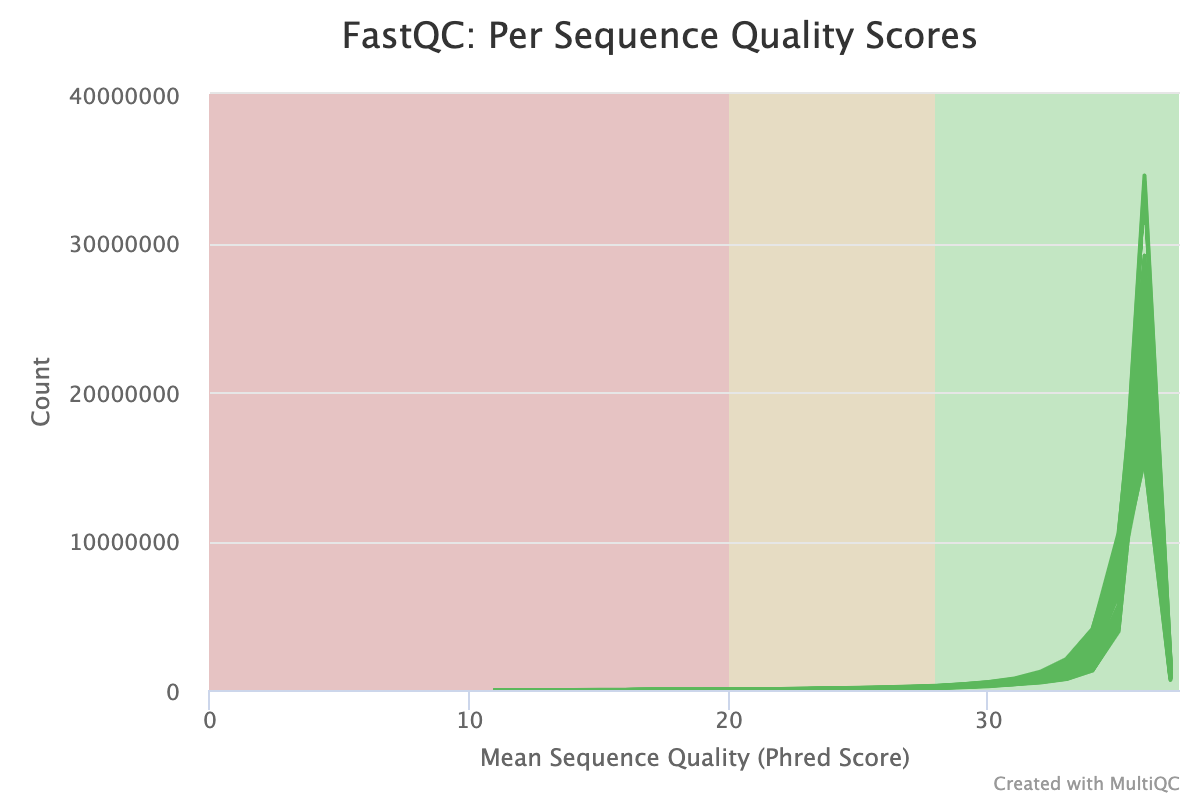 The next step was to evaluate the quality of our sequences using FastQC and MultiQC. I generated a FastQC file for each of the reads, and then combined all of those using MultiQC to look at the quality of all of our reads together. The MultiQC report can be found here (note to view the “pretty version” you will need to download the html file and open the local file since github just shows the raw). Here’s some of the results from that:
